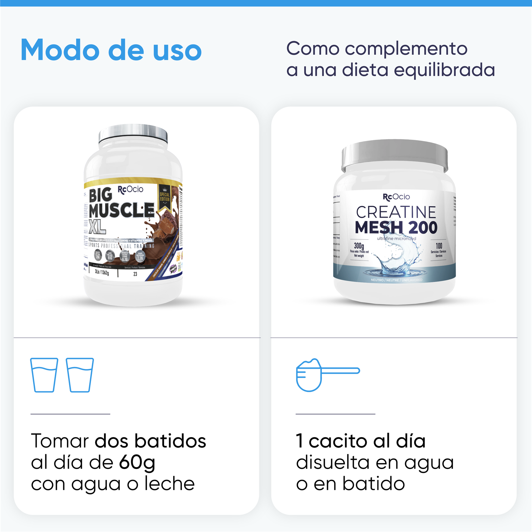 Proteínas (Caseína y Concentrado de suero): BIG MUSCLE contiene estas dos proteínas por su velocidad de absorción, ofreciendo una rápida y lenta liberación de aminoácidos.